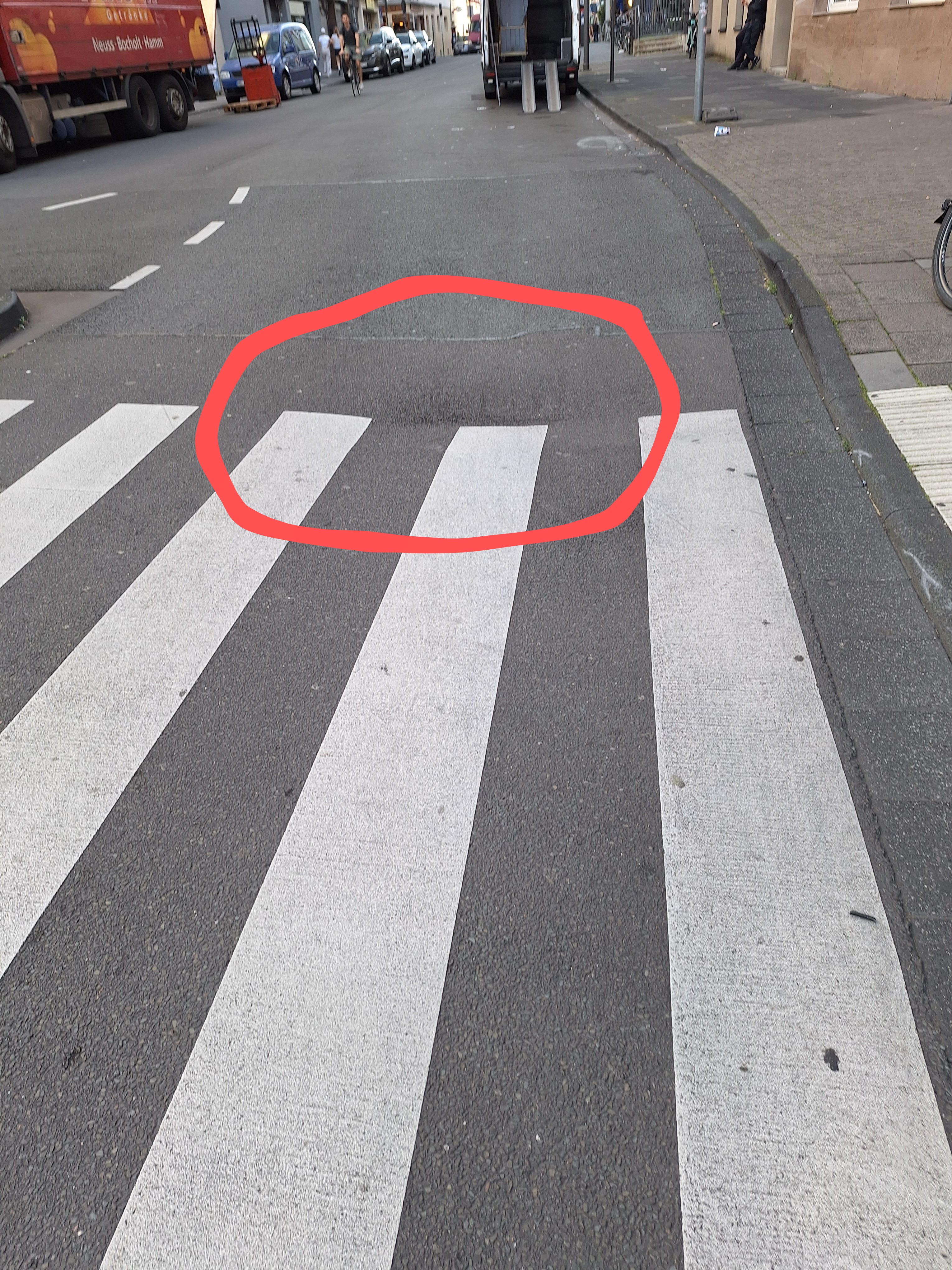 Köln / Cologne, Deutschland | open | Defekte Oberfläche | Am Ende des Zebrastreifens hat sich der Asphalt stark abgesenkt und ein großes Schlagloch ist entstanden. Es ist schlecht zu sehen und hat mir auf dem Fahrrad einen schweren Schlag in die Wirbelsäule verursacht: Gefahr für Radfahrer!