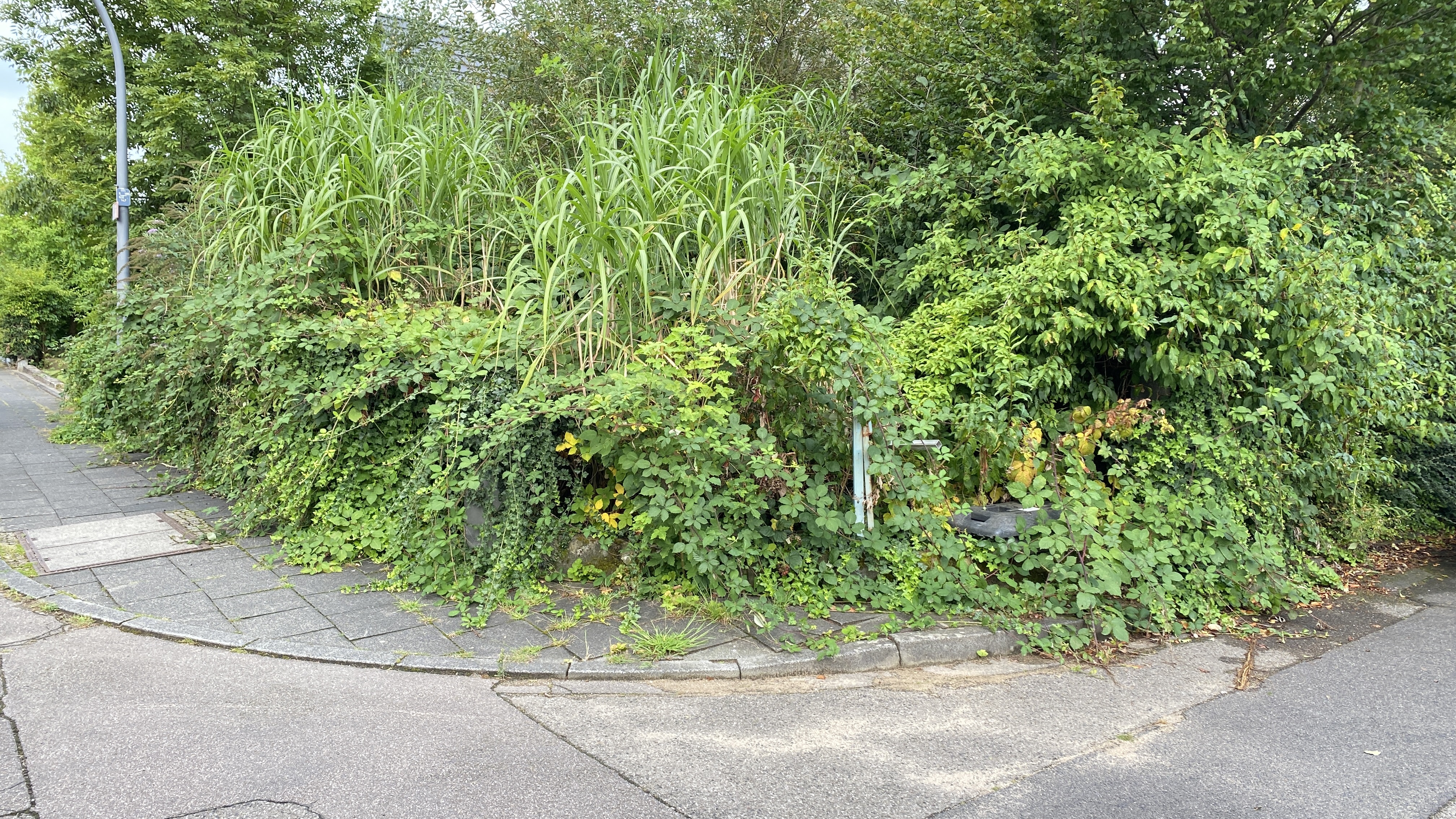 Köln / Cologne, Deutschland | open | Defekte Oberfläche | Der Gehweg ist aufgrund von wuchernden Pflanzen des Grunstückseigentümers nur eingeschränkt nutzbar. Im Haus wohnt niemand den man ansprechen könnte, es ist unbewohnt.