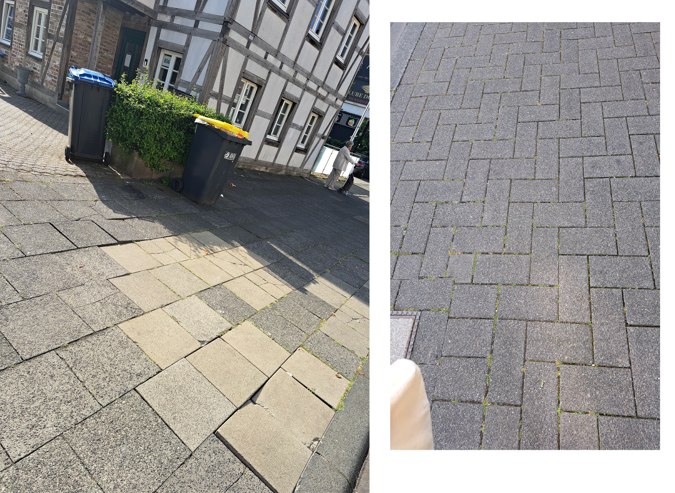 Köln / Cologne, Deutschland | open | Defekte Oberfläche | Der Fußweg an der Hausnummer Berlinerstraße 856, Köln-Dünnwald hat schon wieder los Platten, obwohl dedie Stelle vor einem halben Jahr repariert wurde.