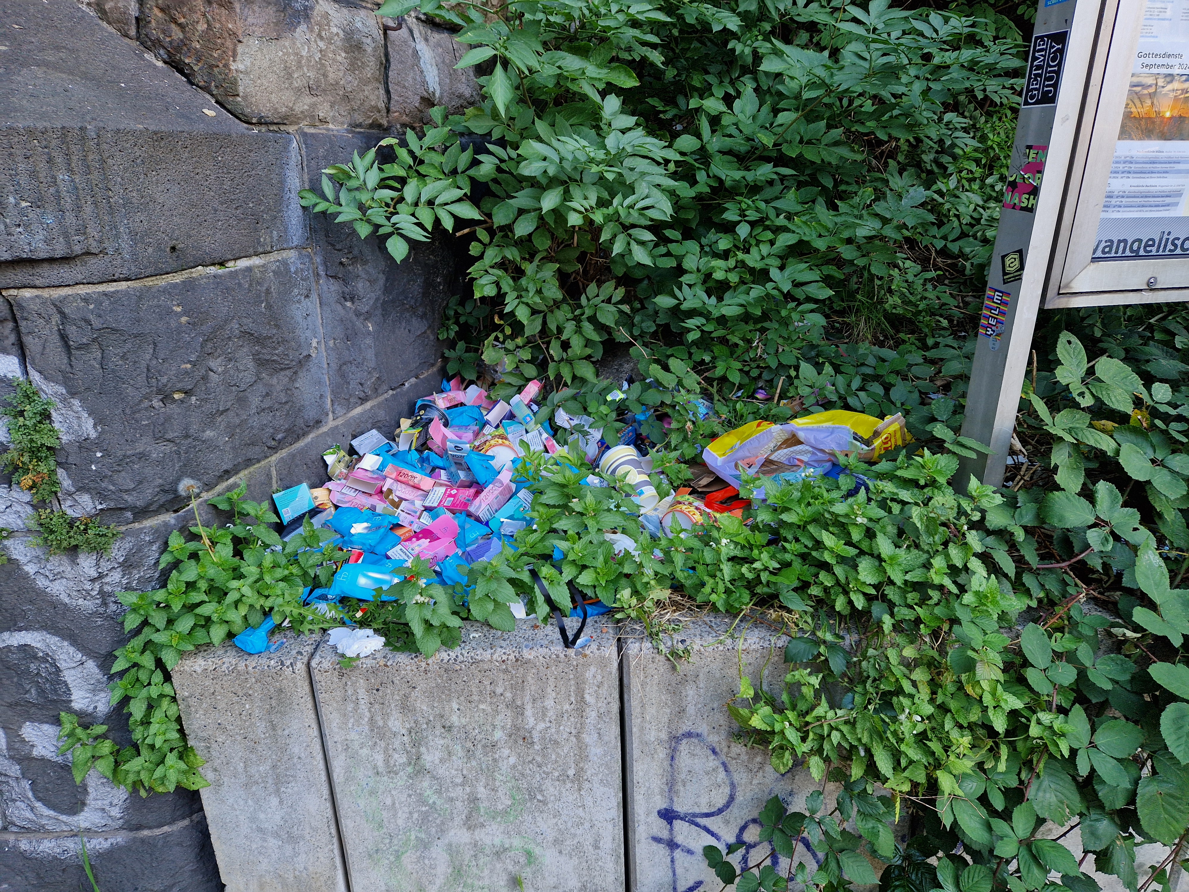 es handelt sich um sehr viel unachtsam weggeworfenen Müll an der Bahnhofsbrücke Ecke Frankfurter Str./Ackerstr. in Richtung Bahnhof.