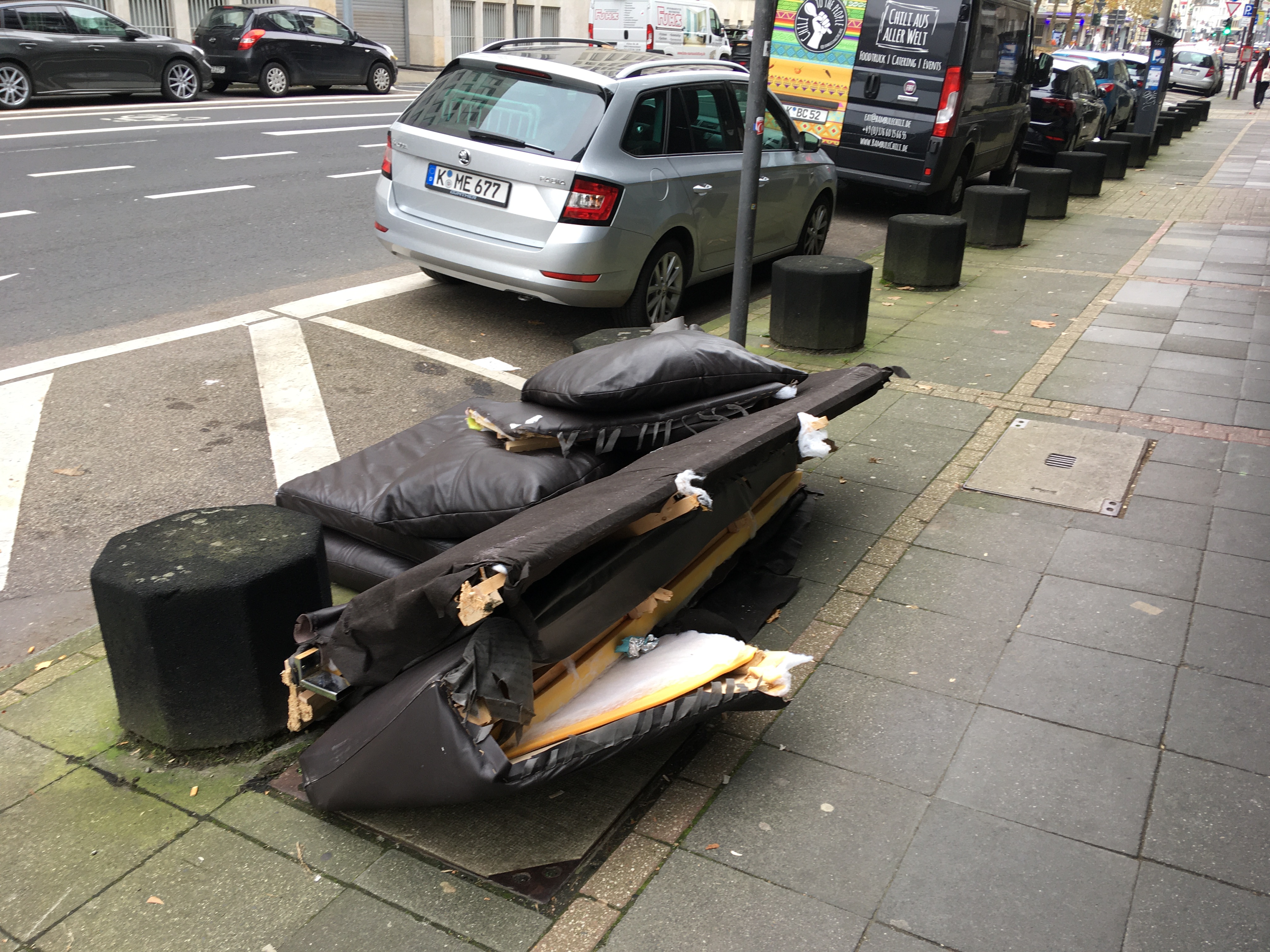 Köln / Cologne, Deutschland | open | Wilder Müll | Seit 10 Tagen liegt dieses mittlerweile zerstörte Sofa dort. Der Bürgersteig rundherum bis zum Ring wurde während dieser auch nicht gesäubert. |  | 11 months ago |