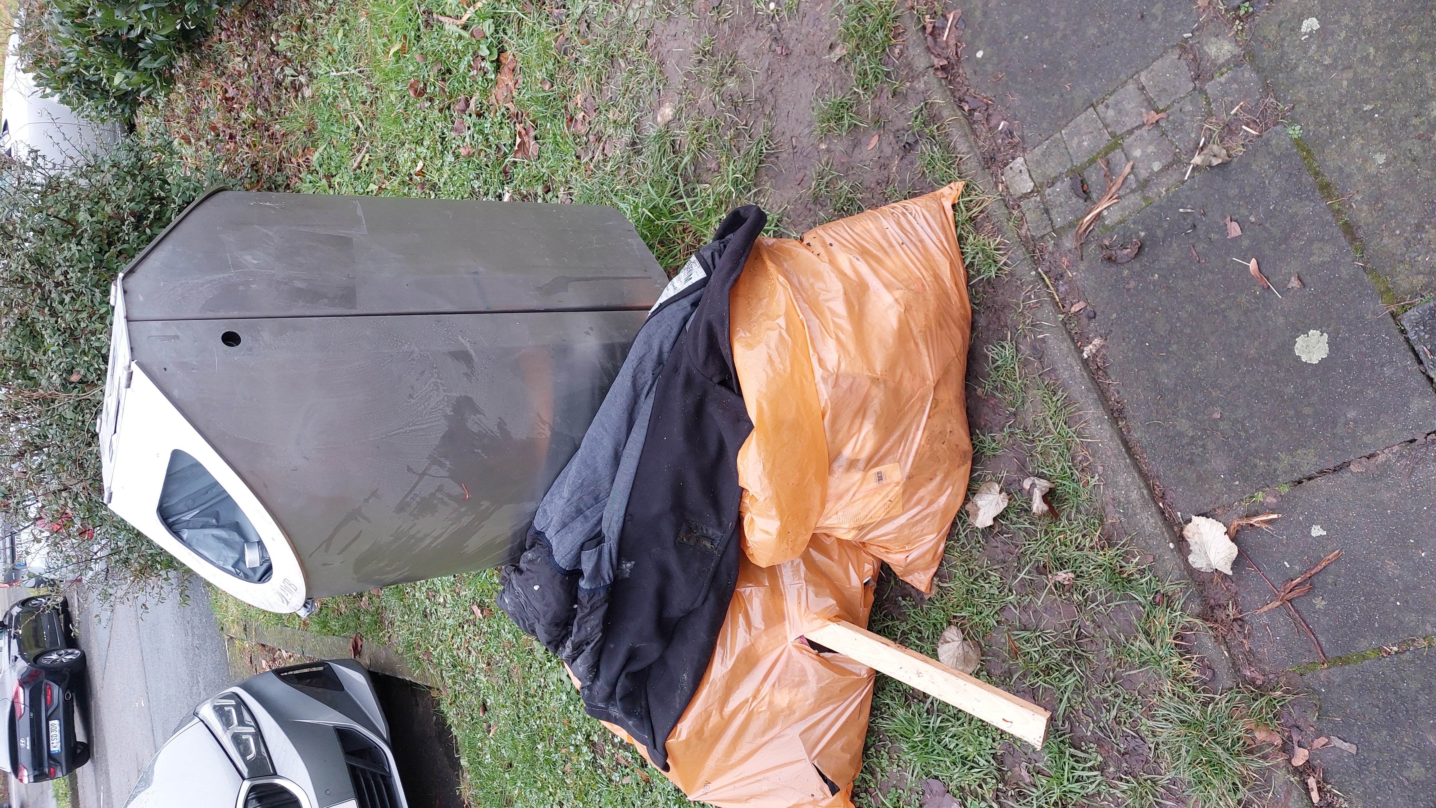 Köln / Cologne, Deutschland | open | Altkleidercontainer-Standort vermüllt | Massig herumfliegene Kleidung rund um Container |  | 10 months ago |