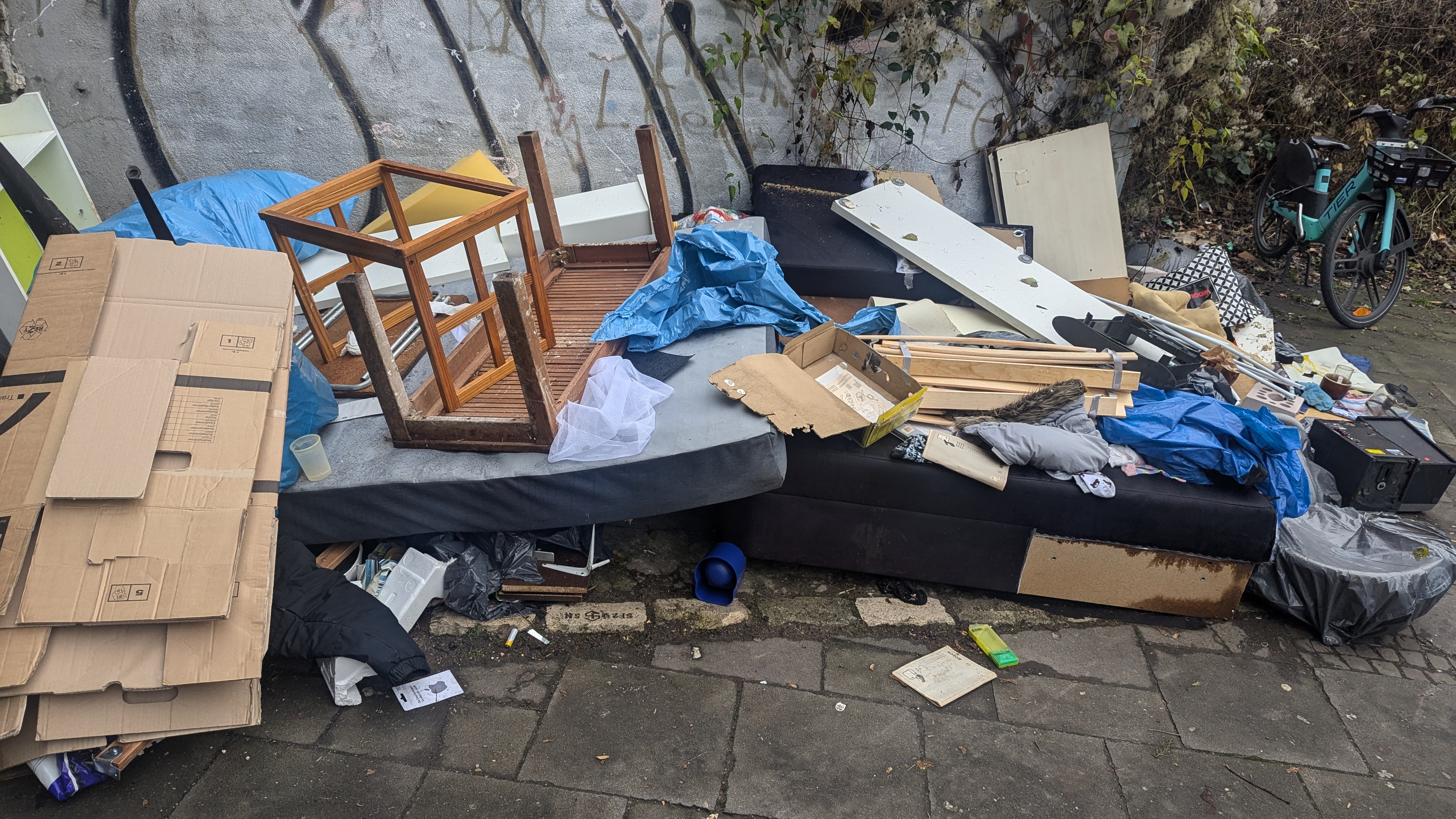 Es ist auch wieder neuer Müll da. Es macht einen nur wütend. In dieser Ecke wird ständig der halbe Hausstand entsorgt. Betten, Sofas, Schränke, Tische, Waschmaschinen, Lampen, Kühlschränke, Gefrierschränke, Autoreifen, Farben und Lacke. Kleidung Kinderwagen... Die Liste ist endlos. Sobald die AWB den Müll abgeholt haben, liegen Abends wieder ettliche Dinge dort. Heute sind es Autoreifen und ein Schrank. Also vor ner Stunde. Jetzt bestimmt wieder noch mehr