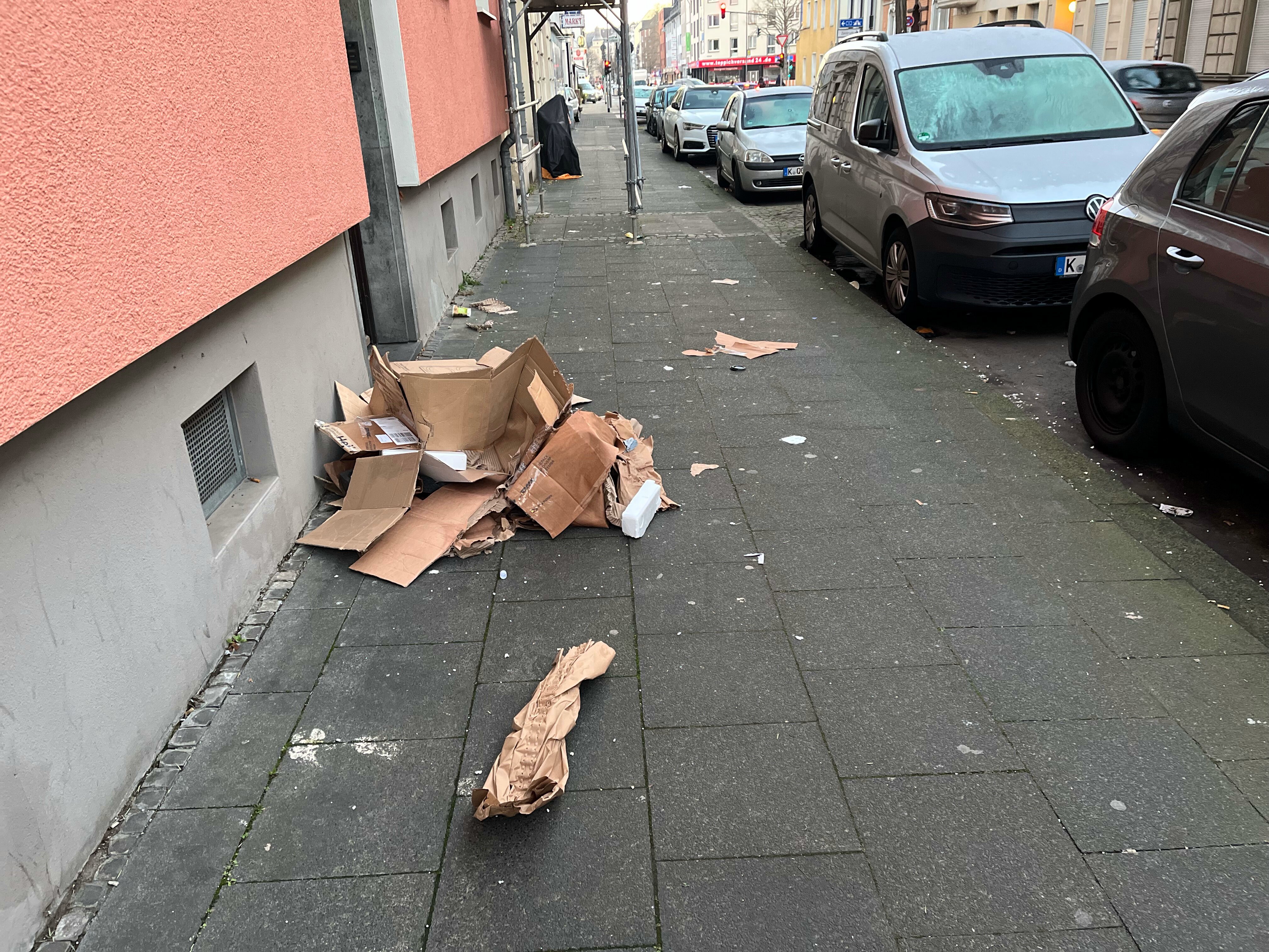 | Köln / Cologne, Deutschland | open | Wilder Müll | Vor dem Haus, auf dem Gehweg, wurde Papier/Pappe entsorgt. Auf einer Verpackung befand sich die Adressatin, Emilia Schuhmacher, Dünnwalder Str. 41, 51063 Köln |  | 11 months ago |