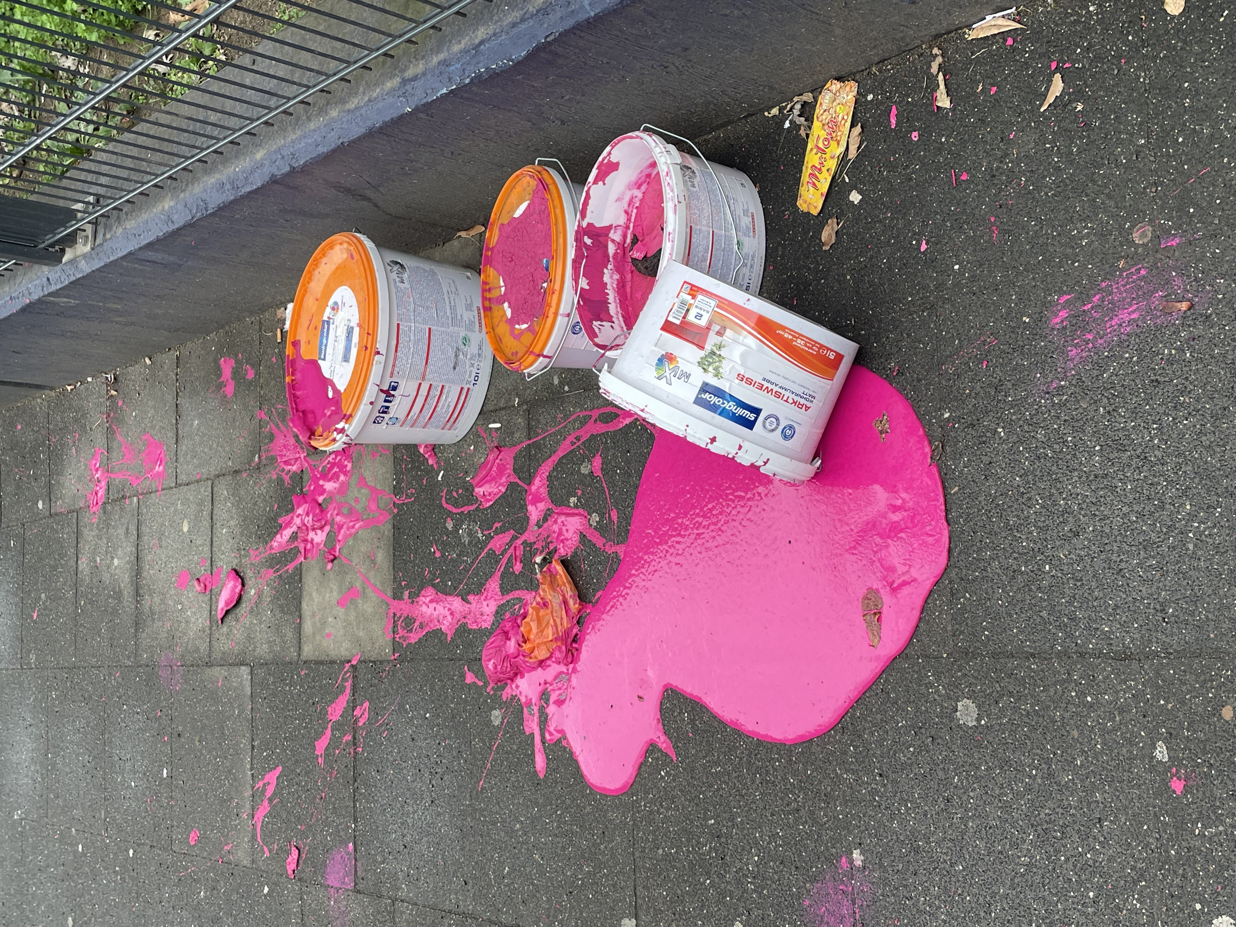 Köln / Cologne, Deutschland | open | Wilder Müll | Gegenüber Schaevenstr. 3 stehen Farbeimer auf dem Gehweg. Einer dieser Eimer ist umgekippt (worden?) und die Farbe auf dem Weg verteilt. |  | 7 months ago |