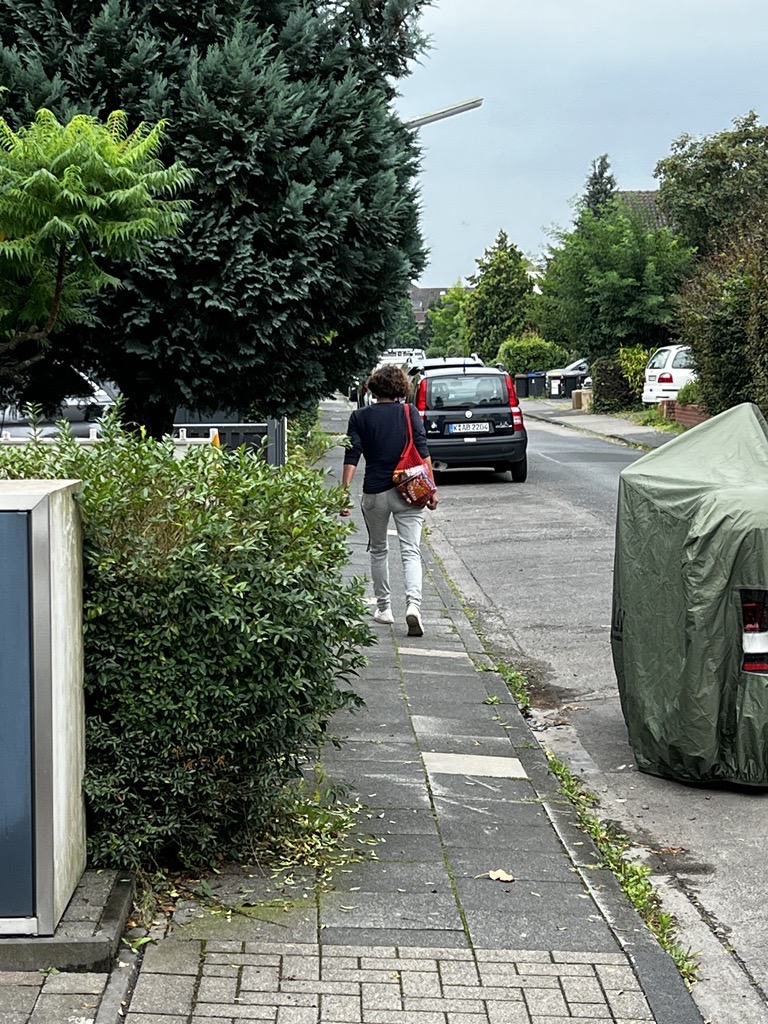Leider war der Bürgersteig für meine Mutter, die auf einen Rollator angewiesen ist, aufgrund einer ungepflegten Hecke nicht passierbar, weshalb wir auf die Straße ausweichen mussten. Diese stellte aufgrund geparkter Fahrzeuge und fließendem Verkehr ein großes Hindernis für meine Mutter dar.
