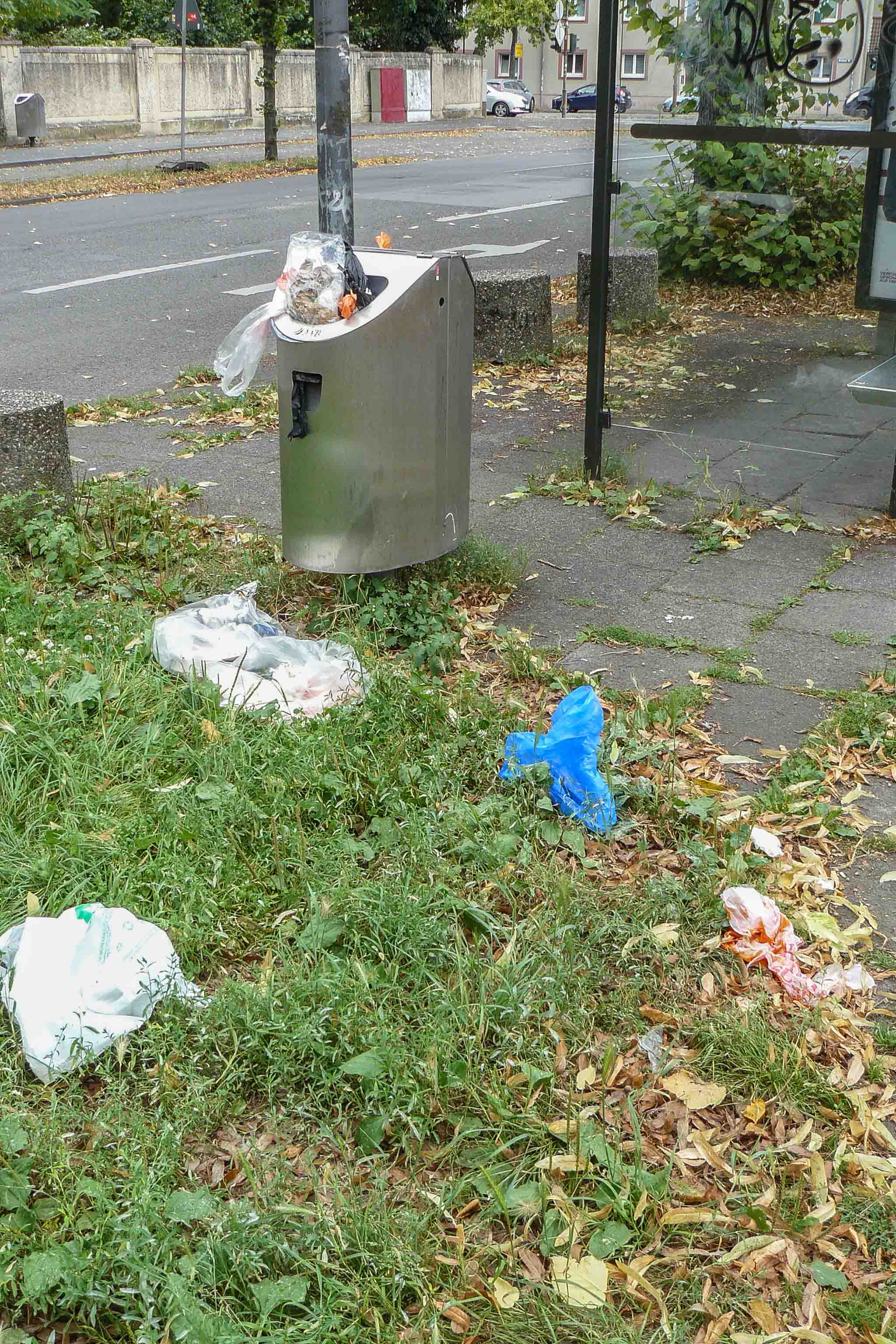 Köln / Cologne, Deutschland | open | Wilder Müll | Aktuell Freitagnachmittag, 29 Grad. Wie auch in der Vergangenheit, erneute Komplettvermüllung der Umgebung um Abfallbehälter an der Bushaltestelle; Reinigung erfolgt leider unregelmäßig.