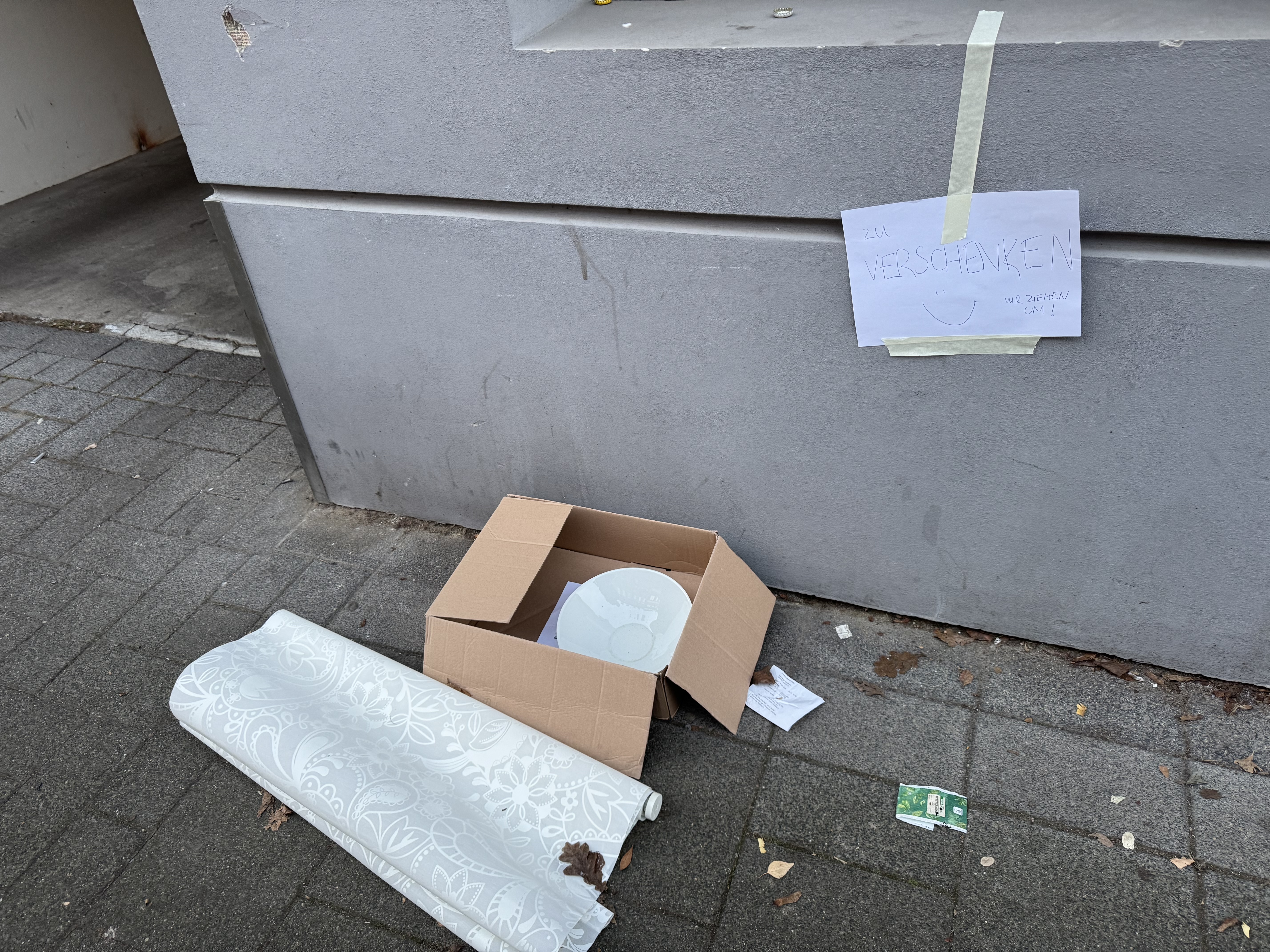 Köln / Cologne, Deutschland | open | Wilder Müll | „Zu verschenken - wir ziehen um“ - prüfen sie bitte mal, wer da seinen Müll auf dem Gehweg verstreut. |  | 8 months ago |